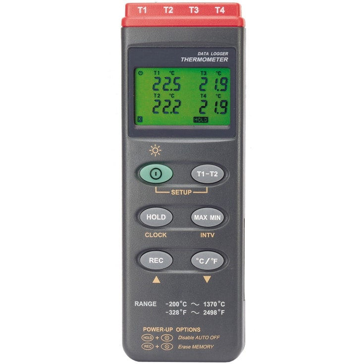 Två givare ingår. Välj ytterliggare två termoelementgivare för att logga på alla fyra kanaler. Displayen visar alla 4 givares värden samtidigt.
